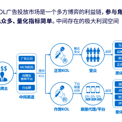 KOL 投放中,整体 13% 有刷量行为,头部 KOL 64% 有刷量行位。刷量收入年规模达 100 亿。