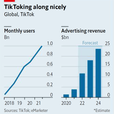 2021 年 TikTok 用户已达 10 亿户。eMarketer 预计 2024 年 Tiktok 的广告收入会达到 240 亿美元左右。