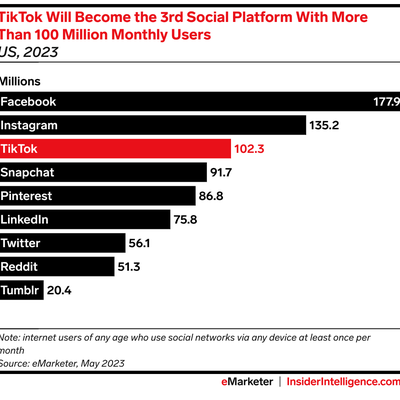 eMarketer 数据显示,2023 年字节跳动旗下的 TikTok 在美国的用户数将突破 1 亿,成为 Facebook、Instagram 之后第三项超过 1 亿用户的社交媒体。