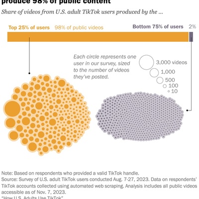 PEW Research 针对美国成年人使用 Tiktok 的消费者习惯进行了调研。从发布短视频的角度,排名靠前的 25% 用户发布分享了 98% 的短视频。其余的 75% 的用户发布了剩下来的 2% 短视频。