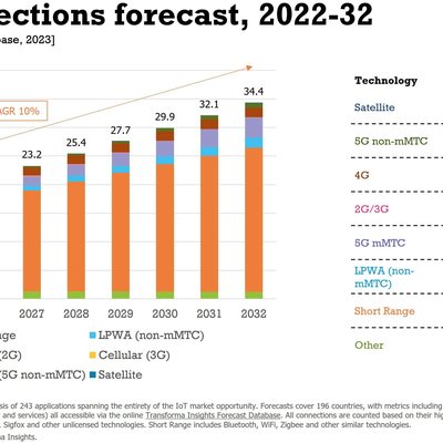 研究机构 Transforma Insights 数据显示,到 2032 年,全球广义物联网(各种常见制式都包含,不限于蜂窝移动网络)连接数可达 344 亿。