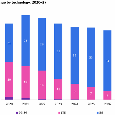 5G 网络的投资会保持增长,2027 年可达 340 亿美元。减少量主要来自 4G LTE 网络。2024 年以后的运营商的投入将少于 100 亿美元。