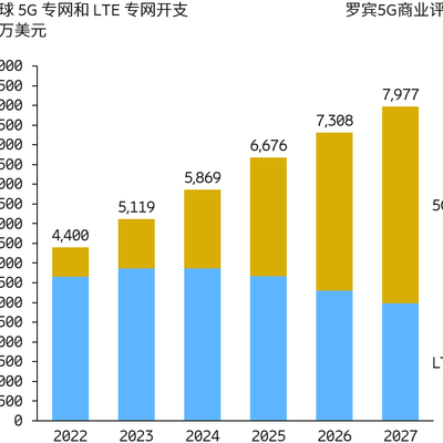 TBR 咨询公司数据显示,2022 年全球 4G LTE 和 5G 企业专网的支出总量为 44 亿美元,预计到 2027 年开支会攀升到近 80 亿美元。