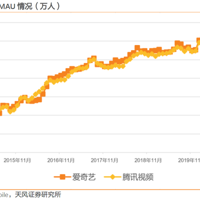附图来自天风证券,中国领先长视频网站(爱奇艺和腾讯视频)月活跃用户数(MAU)近年的变化。