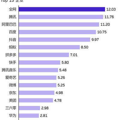 从公司角度,附图是 QuestMobile 统计的 Top 15 企业(去重用户数)。“十亿俱乐部” 有腾讯、阿里巴巴、百度和抖音。
