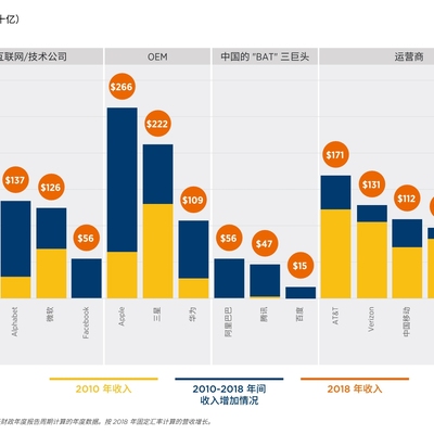 GSMA 做了一张图,代表性玩家在 2010~2018 的增收比较。