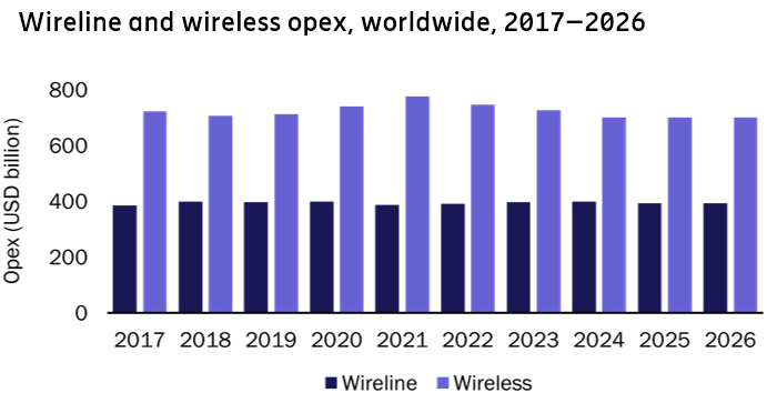 对比 CAPEX 投资,OPEX 运营成本才是电信运营商的开支大头。Analysys Mason 的研究估计全球运营商在未来几年移动网络的 OPEX 维持在 7,000~8,000 亿美元左右,固网的 OPEX 接近 4,000 美元。