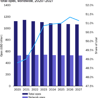 与网络相关的 OPEX 在 5,200 万亿美元左右。占 OPEX 的比例会从 2020 年的 49% 提升到 2027 的 51%。
