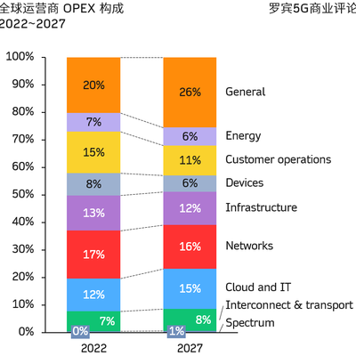 对比 2022 和 2027 年的预测值,(1) General 类(主要营销和销售费用)占比会大幅提升;(2) 围绕客服运营(BSS 和客服)的比例会下滑;(3) 云计算和 IT 相关的 OPEX 会从 12% 提升到 15%。