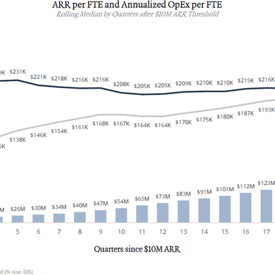 ICONIQ Capital 的研究显示,2023 年硅谷 SaaS 公司人均 ARR 超过人均 OPEX 大约在公司 1 亿美元 ARR 的时候(中位数),而 2024 年这个超越的时刻退后到了公司 ARR 在 1.5 亿美元时。