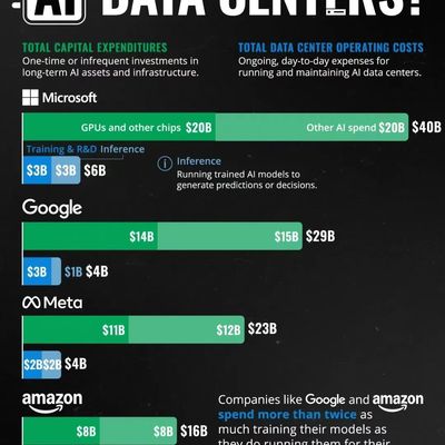 (2) OPEX 中主要包括模型训练和推理(Inference)。每家公司在分配比例上有不同。Google 和 Amazon 的模型训练支出是推理的两倍以上。
