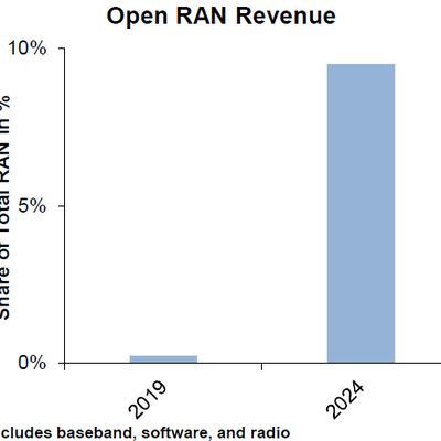 OMDIA 最新的一项研究认为,全球 Open RAN 有可能在 2024 年达到 32 亿美元的收入,占整个 4G 和 5G 无线网络市场的 9.4%。对比而言,Open RAN 在 2019 年的全球销售额为 700