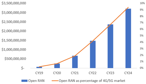 Dell’Oro Group 咨询公司的一项研究估计,到 2024 年 ORAN 至多有机会拿到 10% 的移动网络份额。预计 2020~2025 年期间可累计拿到 10 亿美金销售额。