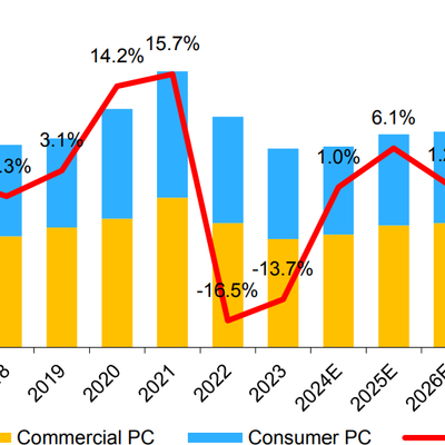 IDC 研究显示,2024 年全球 PC 市场将会重回上升通道。预计 2024 年增幅会达到 1.0%。