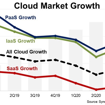 Synergy Research 将云计算分为两大类:云计算基础设施服务(包括 IaaS、PaaS、私有云)和 SaaS(应用层)。根据其研究,2020 上半年云计算的增幅大幅缩减,但 Q3 增幅重新爬升(28% 年度同比增幅)。