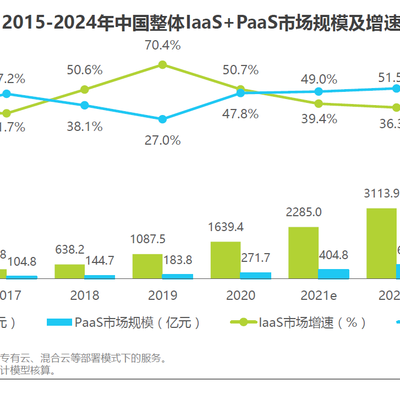 来自艾瑞咨询的研究,针对基础云服务的 IaaS 和 PaaS。预计未来三四年,IaaS 会保持在 30~40% 的增长率,PaaS 则会在 ~50%。