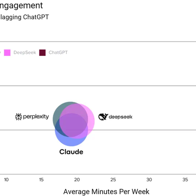 下图中,横轴是用户每周使用的时长分钟数,纵轴是每周使用的会话次数。DeepSeek 已经追上了第二梯队 Claude 和 Perplexity。距离排第一的 ChatGPT 仍有差距。