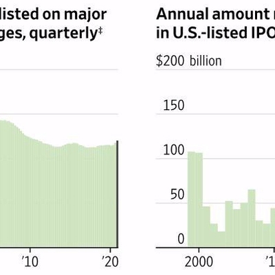WSJ 绘制了一张图,展示了自 2018 年以来,美股上市公司(瞬市值十亿美金及以上)数量一览;2019 ~ 2021是今年新增上市公司的爆发期。