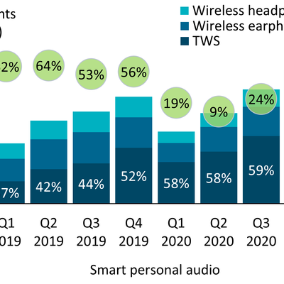 根据 Canalys 的研究,全球 2020 全年共出货 4.32 亿部耳机,其中 TWS 整体占到了 59%。