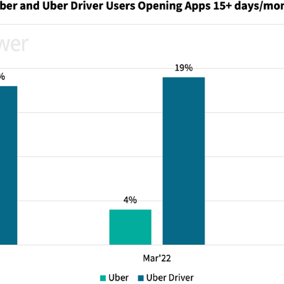 以每月打开过 APP 的天数 15+ 天为指标:2023 年 3 月,Uber(乘客)有 5% 比例,User Driver(司机)有 21% 的比例达到此指标。
