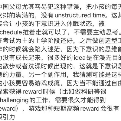 ⑵ 显然此类自我驱动的培养,不应等到大学毕业进入职场后;反倒你会发现很多看起来很上进的人,到了大学,或者进入职场,或者步入中年后,越发失去自我驱动力。