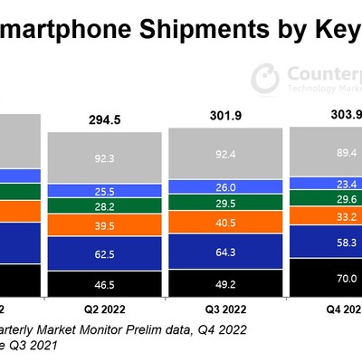 Counterpoint 咨询公司的数据显示,全球智能手机的在 2022Q4 的出货量同比 2021Q4 大幅下跌。大部分品牌都的下跌区间都在 13~20%。