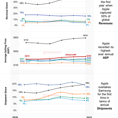 (1) 收入份额:2018 年 Apple 只有 38% 的份额,2023 年提升到了 50%。