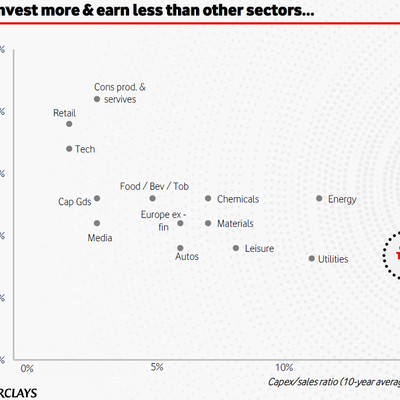 图一来自投资银行 Barclays,从 ROCE(普通股权益报酬率)和 CAPEX 在销售收入占比两个维度指标看,电信行业投入最多,回报最低 ……
