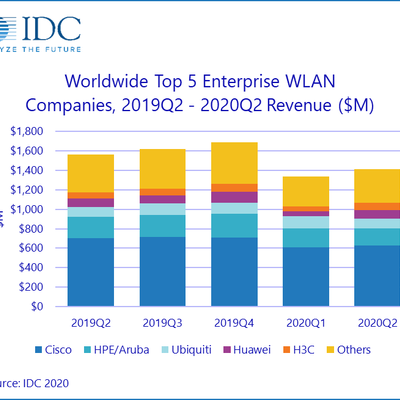 根据 IDC 发布数据,2020Q2 全球企业 WLAN 设备的销售额为 14 亿美金,对比前一年下降了 9.5%。IDC 认为下降主要受制于新冠疫情的影响。