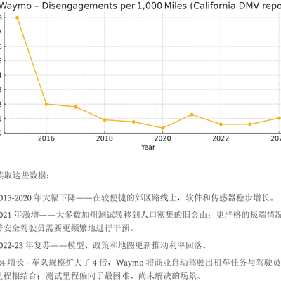 如果只看图,会容易得出结论 2020 年之前,随着 Waymo 汽车的传感器、数据积累、软件和算法模型的优化,Waymo 被驾驶员 “接管" 的次数越来越少,自动驾驶的成熟度日趋提高。