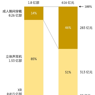 GFK 数据显示,2022 年中国个人穿戴产品的市场规模达到了 616 亿元,其中成人腕间穿戴产品为 283 亿元,立体声耳机 313 亿元,XR 20 亿元。
