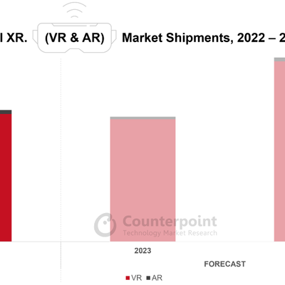 Counterpoint 估计 XR(VR & AR)在 2023 年的出货量会微低于 2022 年,但受益于 Apple Vision Pro 在 2024 年的批量供货,预计 2024 年全球 XR 出货量将达到 390 万部,创历史新高。
