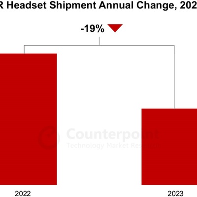 Counterpoint 的数据显示,2023 年 XR(AR 和 VR)头显终端整体出货量下跌了 19%。从皮牌看,Meta 继续占绝大头份额,SONY 和字节跳动旗下 PICO 也有一定增长。