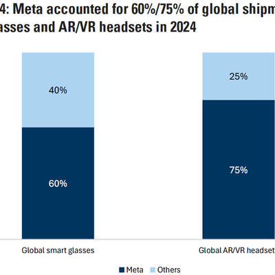 IDC 和 Counterpoint Reseach 数据显示,Meta 在 AI 智能眼镜和 AR/VR 头显上均占据了出货量的大头,分别为 60% 和 75% 份额。