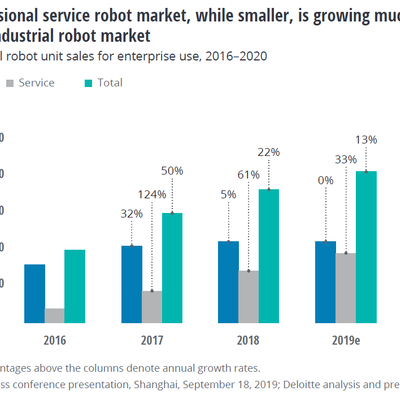 Almost 1 million robots we expect to be sold for enterprise use in 2020, we predict that just over half of them will be professional service robots, generating more than US$16 billion in revenue—30 percent more than in 2019.