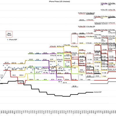 Asymco 绘制了一张图,展示了 2007 年初代 iPhone 上市以来所有款型的价格。可以清晰的看到 IPhone 是如何变得 “越来越贵的”。