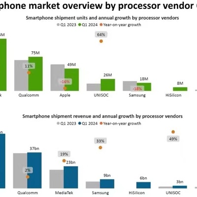 从处理器出货量角度联发科(MediaTek) 和高通(Qualcomm)均取得了大幅增长。Apple 有 -16% 的下滑。
