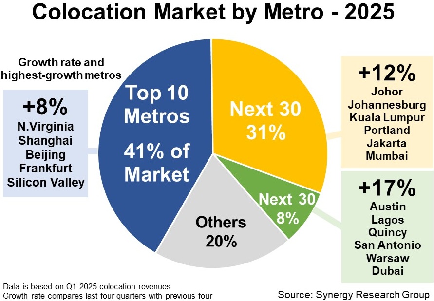 Synergy Research 对数据中心主机托管市场的研究显示,全球 Top 10 的都市圈(Metro)占据了 41% 的市场份额,被归为第一梯队。