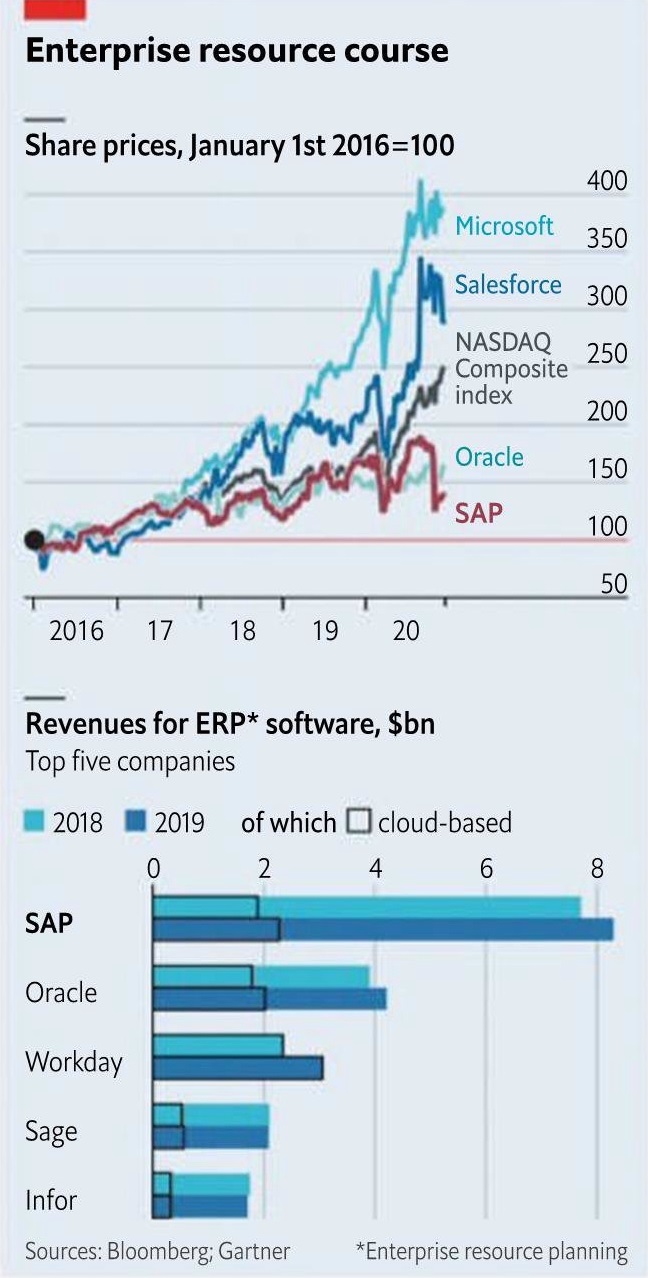 讨论到企业管理软件,最常见的名词是:ERP、CRM、HR 系统等。经济学人绘制了一张表格,对比了全球企业管理软件领域的巨头们 2016 年至今的股票表现。