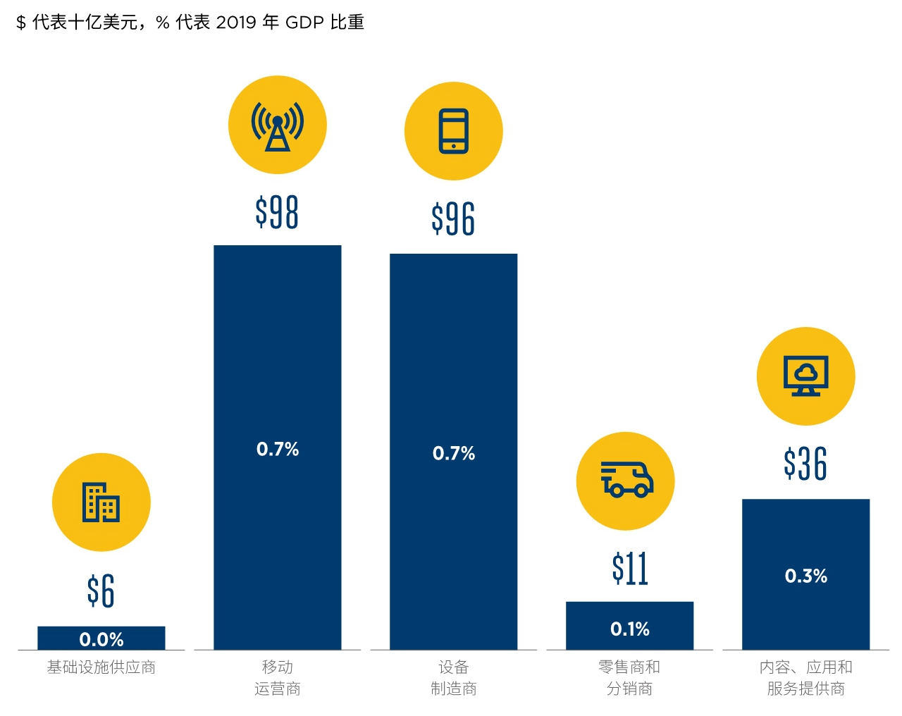根据 GSMA 的估算,中国移动生态系统直接创造了 2,500 亿美元的经济价值(占 GDP 1.8%),绝大多数来自:(1) 移动运营商(占 GDP 0.7%);(2) 设备制造商(占 GDP 0.7%);(3) 内容应用服务商(占 GDP 0.3%) 。