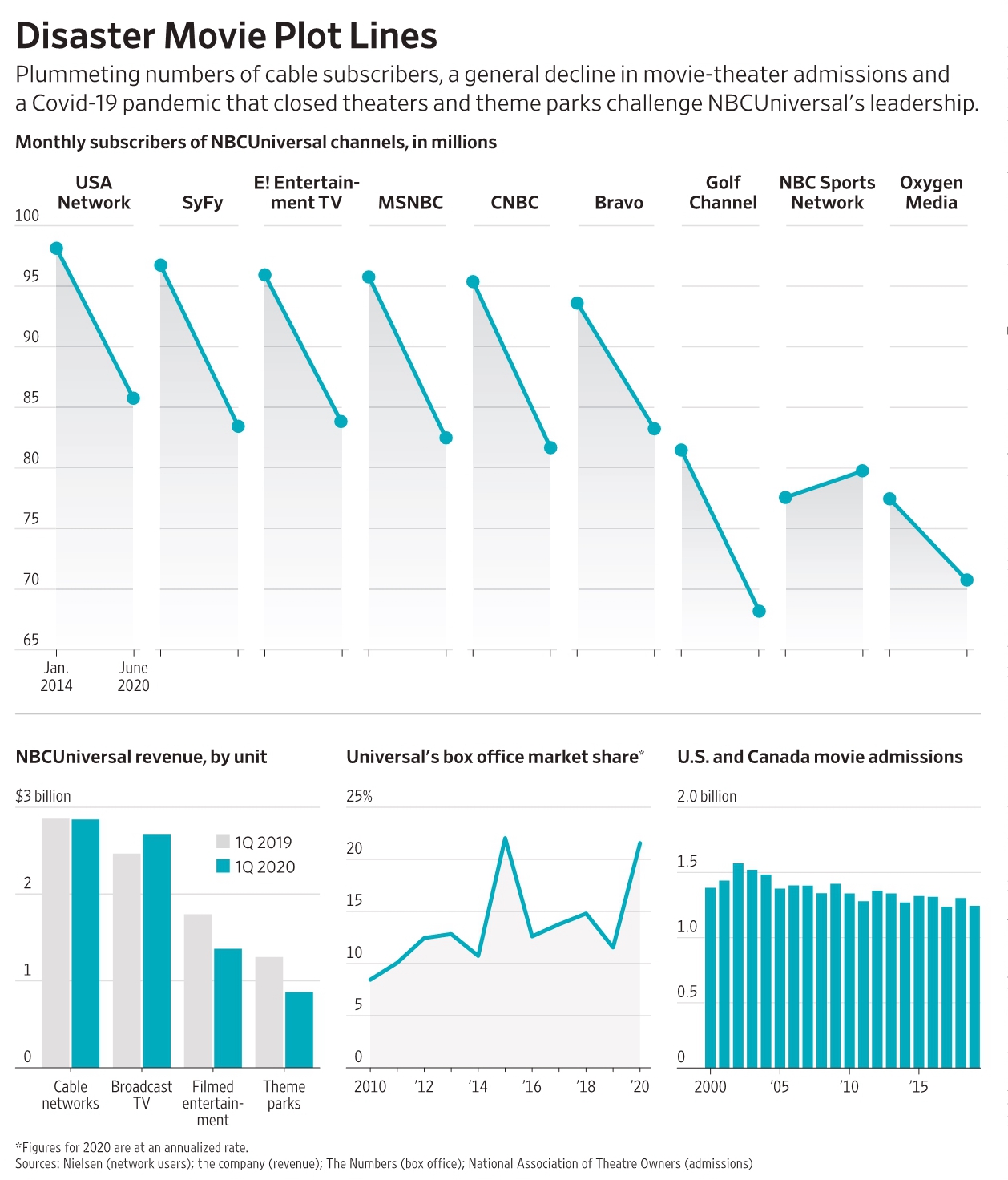 作为美国传统电视媒体品牌代表,NBC Universial 面临互联网的剧烈冲击。通过 WSJ 绘制的一系列图表,我们可以看到一些规律;