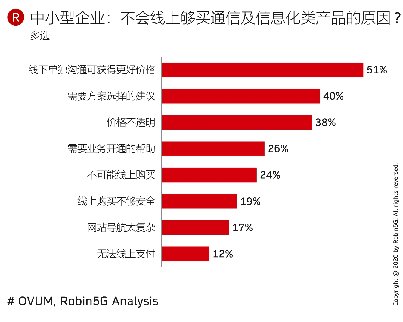 正好看到 OVUM 的一组调研(2018/2019 Soho & SME),针对中小企业线上购买的行为意愿:(1) 能够说服你线上购买的原因;(2) 不会线上购买的原因。