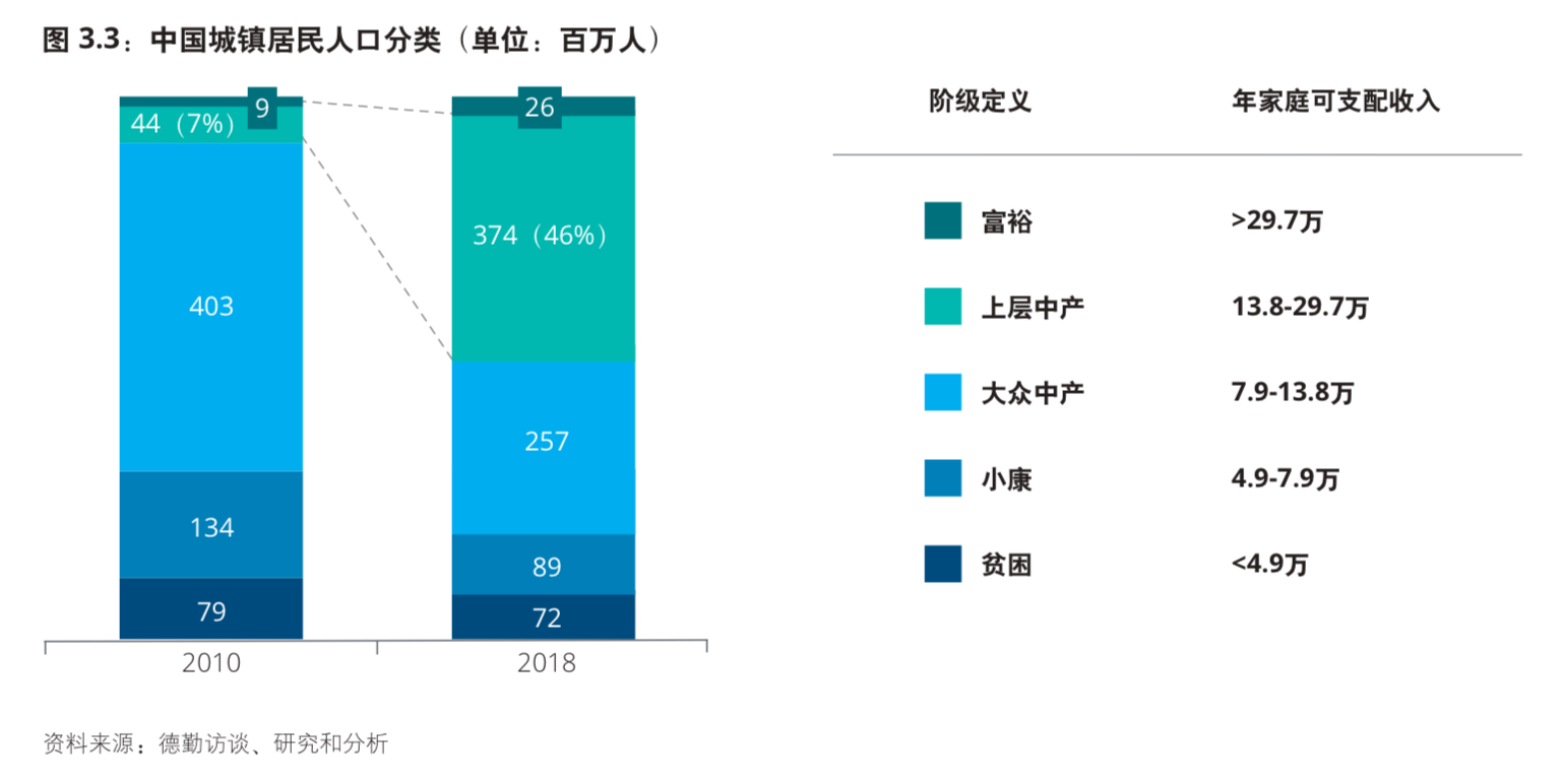 德勤的一项研究,对比了 2010~2018 的城镇居民的家庭年收入分布。