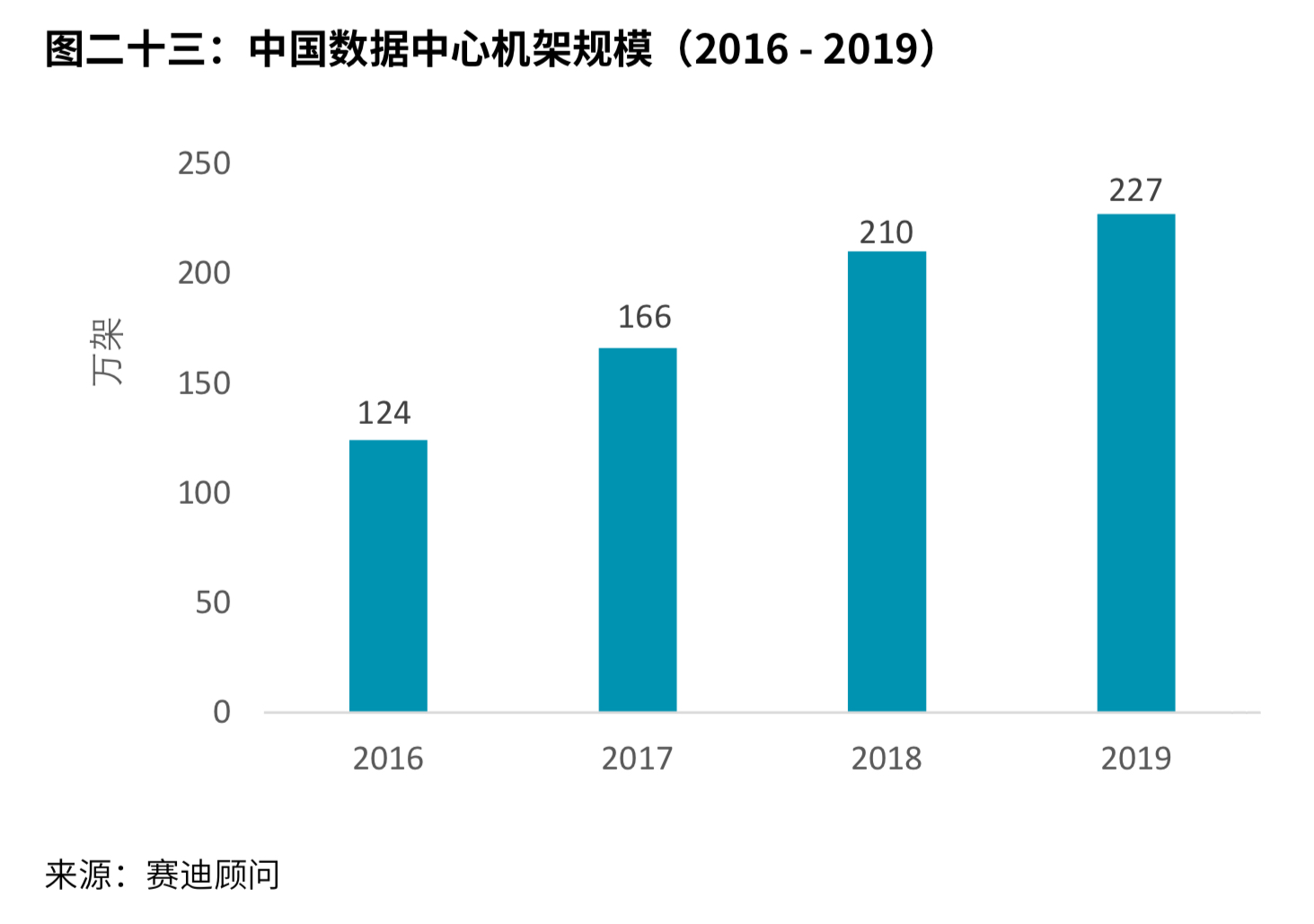 根据赛迪的数据,2019 年中国数据中心约有七万个,共计 227 万机架。