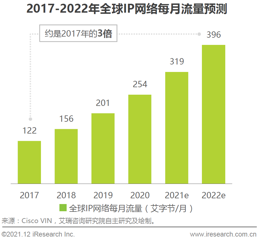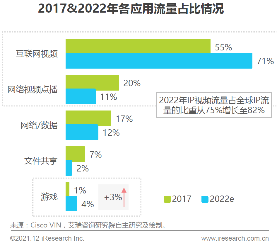 Cisco VNI 估计 2022 年全球 IP 网络流量时 2017 年的 3 倍。视频流量将占全网流量的 82% 以上。