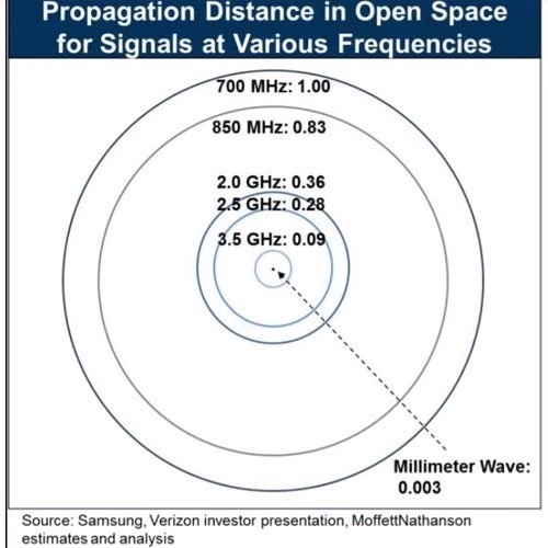 5G 可以工作在不同频率。一般来说,频率越低,单基站的覆盖范围就越广阔。但频率越低,频谱带宽就越小,进而对用户来说可能速率就不够理想。