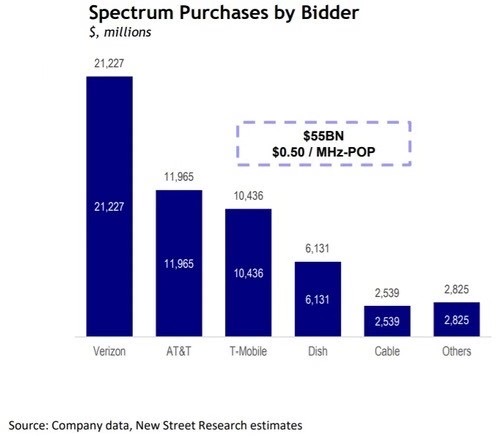 转 Wei Hang 的评论: 我国运营商中低频谱免费颁布,对比一下美国。1)主管单位FCC把3.7-3.98GHz共280MHz切成14单元卖,把全国领土划分成406个覆盖区,所以共计5684个频谱license可以拍卖;2)截止到昨天,5684个license经过43轮举牌,拍卖总额为664亿美元;3)拿纽约市这个区域距离,100MHz目前拍卖价5.66亿,下一轮起拍价以它为基础;4)目前的拍卖总价已远超机构预测的210亿或352亿总价格。5)有人发出警告,欧洲就是在WCDMA之前玩儿了大拍卖导致失去全球信息通信优势地位。