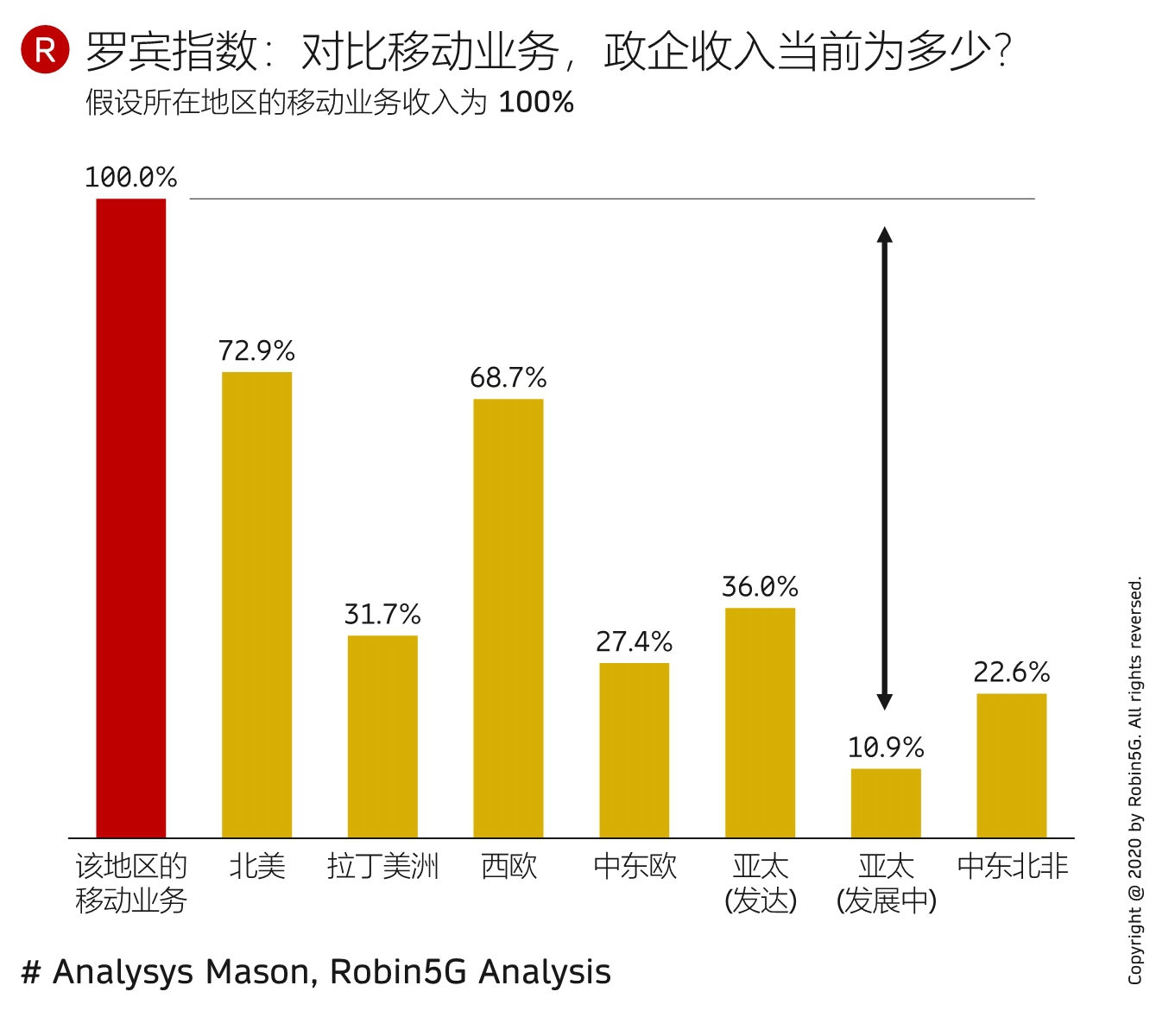假设移动业务收入为 100%,政企业务在各地区差异较大,北美和西欧处于领先水平(68~72%),亚太地区则处于相对较低水平,可认为有发展潜力。