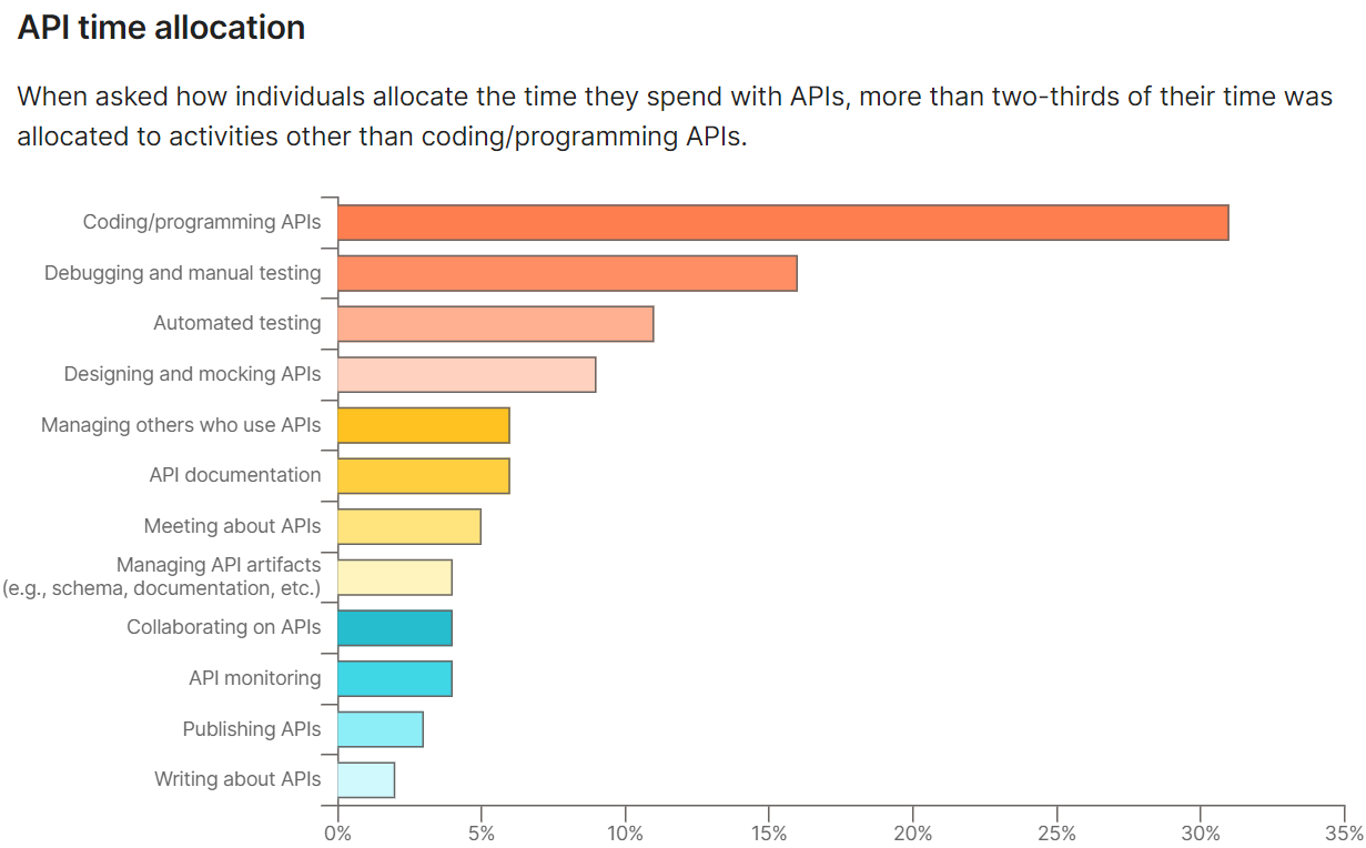 Postman 的调研发现:就开发者而言,起码三分之二的 API 开发时间没有用在编程上,而是各种配套工作(查找、学习、管理、测试、工具准备等)。
