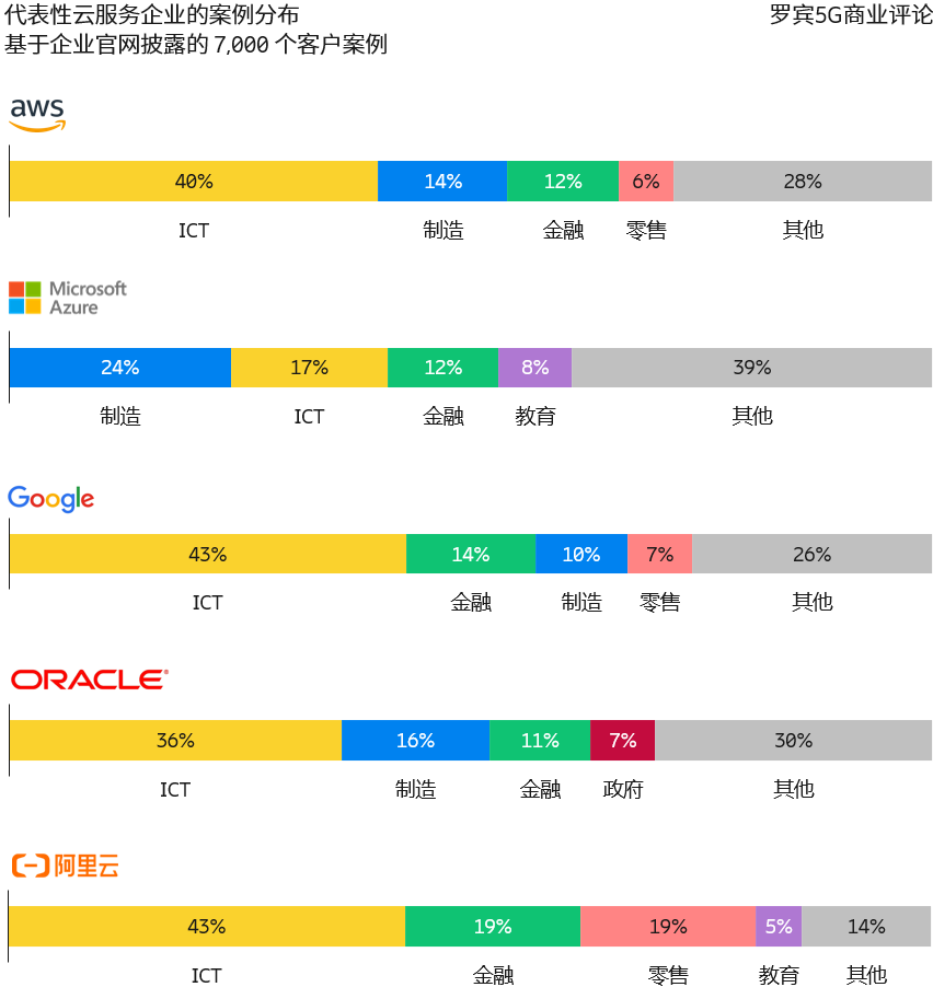 (1) ICT 普遍是云服务占比最高的行业,五家企业中有四家 ICT 行业客户的占比是最高,而且均在 40% 比例上下;